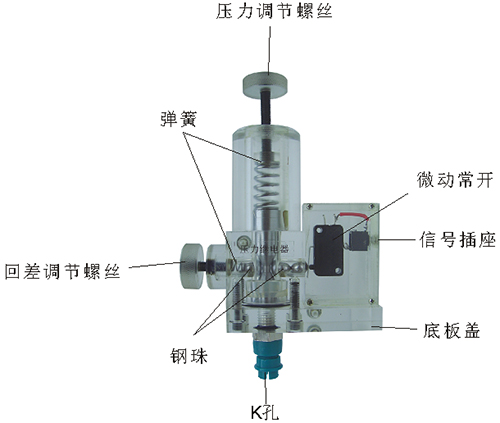 2、壓力繼電器其殼體,底板蓋采用了進口透明有機玻璃材料精制而成,閥芯采用45#中碳鋼材料,安裝了微動開關及信號插座。配合彈簧,油接頭,密封圈、鋼珠、內六角螺絲等標準件裝配而成,通過它可明確地觀察到閥芯、彈簧、鋼珠等結構及其在壓力油作用下的運動過程和觸點通斷。