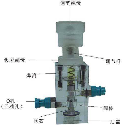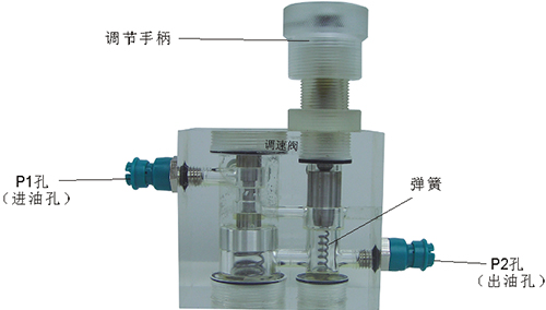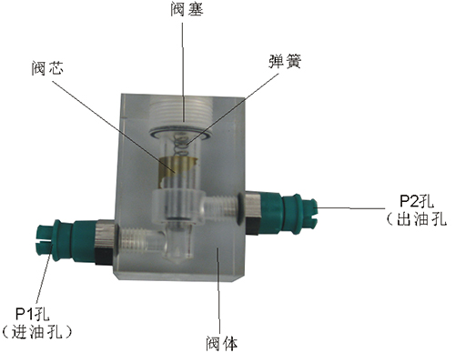 2、單向閥結構上參考了國產I--63B型板式單向閥,其閥體,螺塞等采用了進口透明有機玻璃材料精制而成,閥芯采用了45#中碳鋼材料,并配合彈簧,油接頭,密封圈等標準件裝配而成,通過它可明確地觀察到活塞、彈簧、油孔等結構及其運行過程,具有形象逼真,性能可靠等優點。它即可作為教學模型,也可以作為液壓實驗元件進行實驗演示。