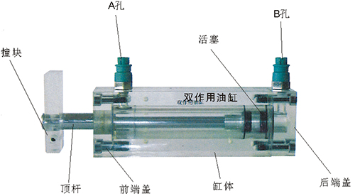 2、雙作用油缸的缸體,端蓋,行程撞塊,撞塊支承等均采用了進口透明有機玻璃材料。頂桿采用了45#中碳鋼,并配合油接頭,密封圈,內六角螺絲等標準件精制而成。能通過它明確地觀察活塞、頂桿、油封、油孔等結構及其運行過程。