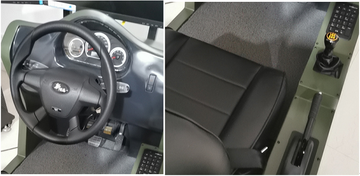 2)開放式艙體,方向盤、變速機構、手制動、加油踏板、制動踏板、離合器踏板等實裝主要操作部件均需要模擬,其外觀尺寸、部署相對位置、操作行程,以及操作力度感受與實際基本一致,操縱機件性能工作可靠、操作靈活、低噪音。